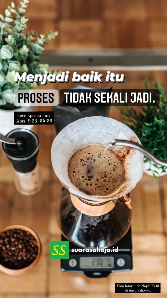 Menjadi baik dalam pengertian, kita mengenali segenap kekuatan yang ada di dalam diri, menjadi bahagia karenanya dan karenanya kita pun dapat memberi kebahagiaan kepada orang lain tidak pernah sekali langsung jadi. Pasti ada proses yang ditempuh. Jam demi jam, hari demi hari, minggu demi minggu, bulan demi bulan, tahun demi tahun. Selagi Allah izinkan kita untuk bernafas, maka dengan iman kita percaya bahwa sejauh itu juga kita mendapatkan banyak kesempatan untuk menjadi bahagia, dan memberi kebahagiaan pada sesama kita karena menyimak, menyambut dan menghidupi hikmat.